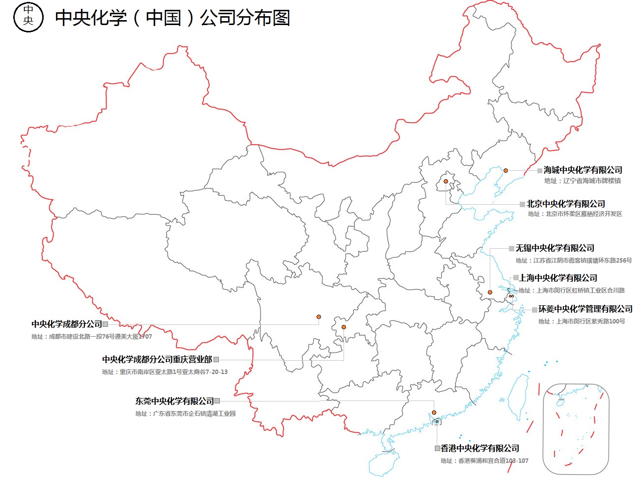 设立于2009年,系中央化学集团公司在中国西南片区一次性塑料食品包装容器销售及配套服务的总窗口,于成都、重庆分别设有营销部门及物流仓储,经销产品品种1000种以上。